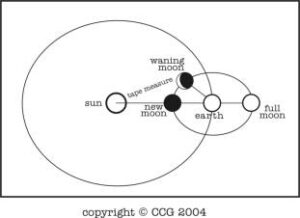 图注:sun(太阳),new moon( 新月)earth(地球),full moon(满月)waning moon(月亏)tape measure(卷尺度量)