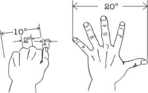 紧握的拳头(不包括拇指)跨度为大约10度,而完全张开的手,从拇指尖至小指尖为20度。较小的角度我们用其他准绳。例如,在一臂之长,我们小指的宽度为大约1度。面向上的拇指宽度为大约两度,它的侧面为1度,而从我们拇指尖至第一个连接点的距离是大约3度。