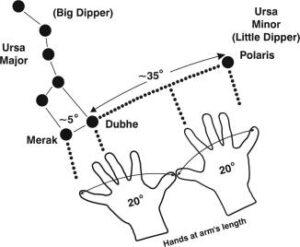图注:Big dipper(北斗七星), Ursa Major(大熊星座), Ursa Minor(小熊星座), Merak(北斗二星), Dubhe(北斗一星), Polaris(北极星), Hands at arms length(手在一臂长度)。