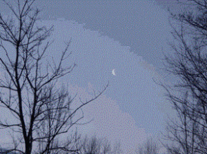 当月球在天空东移离开太阳时,我们每个晚上看到多一点它被阳光照射的一面。因此,在新月几天过后,我们可以在西方傍晚的天空看到一个细小的新月。这时,以及接着的几个晚上,我们可以看到月球黑暗的一面被从地球反射的阳光微略照明。