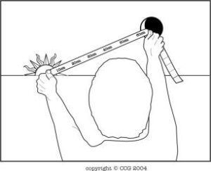 要校准卷尺和我们的体积,我们对着墙而立然后在我们的眼睛和墙之间尺量60厘米。若我们的手太长或太短,我们将需作出调整,因为它在测定度数因而一个距程的时间,即在我们的事例中是太阳和月球距程的时间方面,是重要的。
